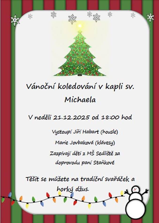 oznamujeme Vám, že provoz Mateřské školy bude v době vánočních prázdnin přerušen od 22. 12. 2025 do 2. 1. 2026 (včetně).